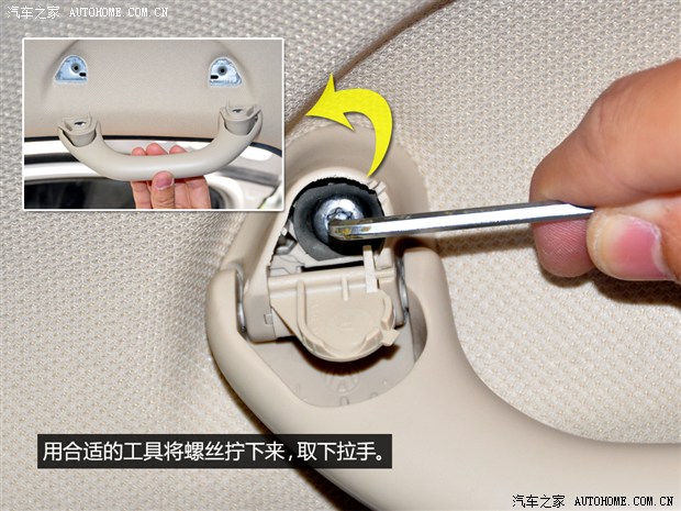 首先是将拉手从顶棚拆下来,要注意的是,固定顶棚拉手的螺丝普遍比较长,所以建议用螺丝刀来拧,另外,这里的螺丝有普通十字的,也有花键螺丝,所以一定要用合适的工具来操作。