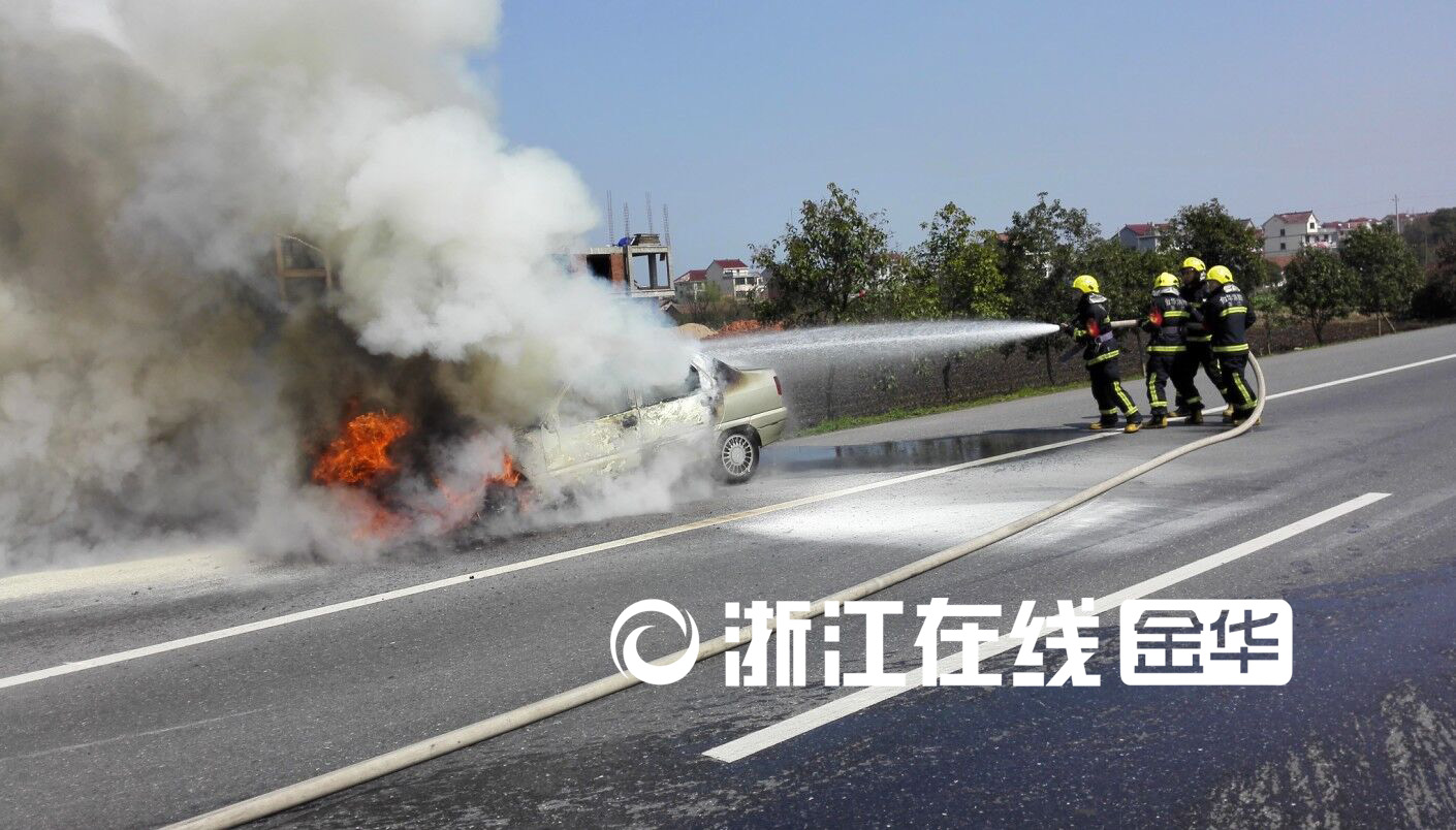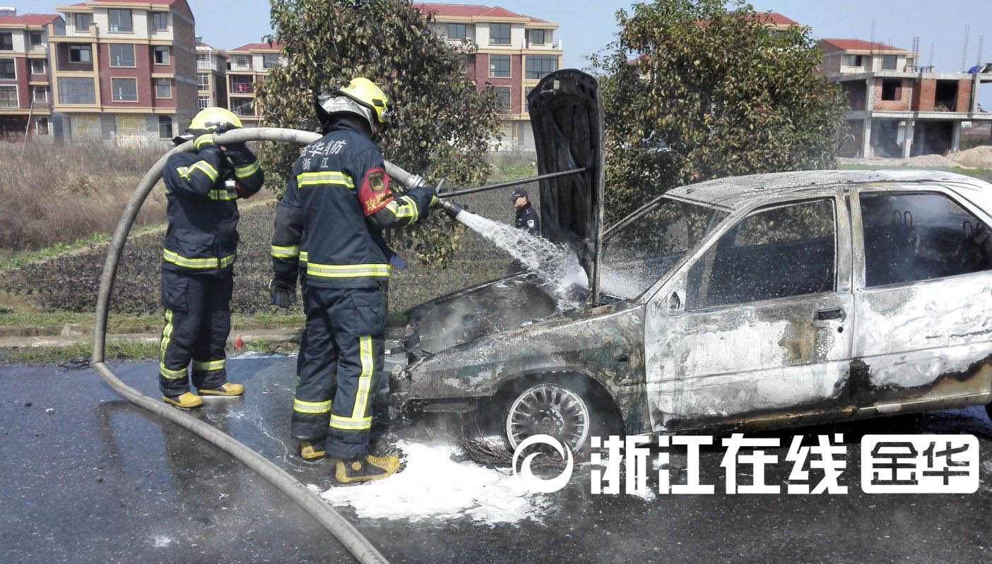 浙江在线金华频道3月2日讯(通讯员 方卫东)3月2日中午12时16分左右,在宾虹西路郑岗山村路段,一辆行驶中的东风雪铁龙轿车突然起火,火势从引擎盖部位迅速向四周蔓延。危急时刻,由于车辆没有携带灭火器,延误了最佳扑救时间,最终等到消防官兵赶来后才将火势彻底扑灭,不过此时整辆车已经被基本烧空。