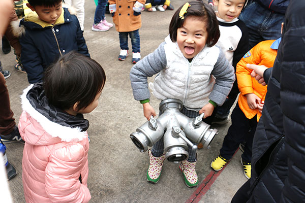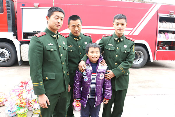 在家长的带领下,小朋友整齐有序地走进营区,消防官兵按照计划首先给孩子们表演了快速穿消防服等节目,小朋友们掌声不断。随后,官兵们带领孩子及家长们认识了云梯消防车、抢险救援车、水罐车及常见的消防器材,并在会议室给小朋友上了一堂生动活泼,通俗易懂的消防常识课:如何拨打119并自救、火灾的危害、家庭着火怎么办等等。最后,为了表示对消防员官兵的敬意和感谢,小朋友排着整齐的队伍给消防官兵送出精心准备的水果篮和鲜花,消防员顿时被感动,只觉自己的奉献是值得的。在一片欢声笑语和依依不舍中,活动结束了。“警察叔叔辛苦了”、“警察叔叔,再见!”,这是他们最天真的心声。