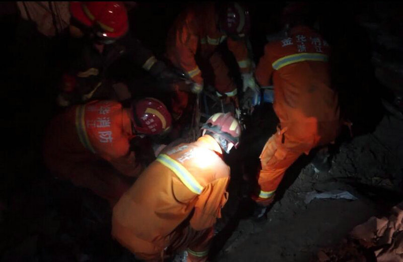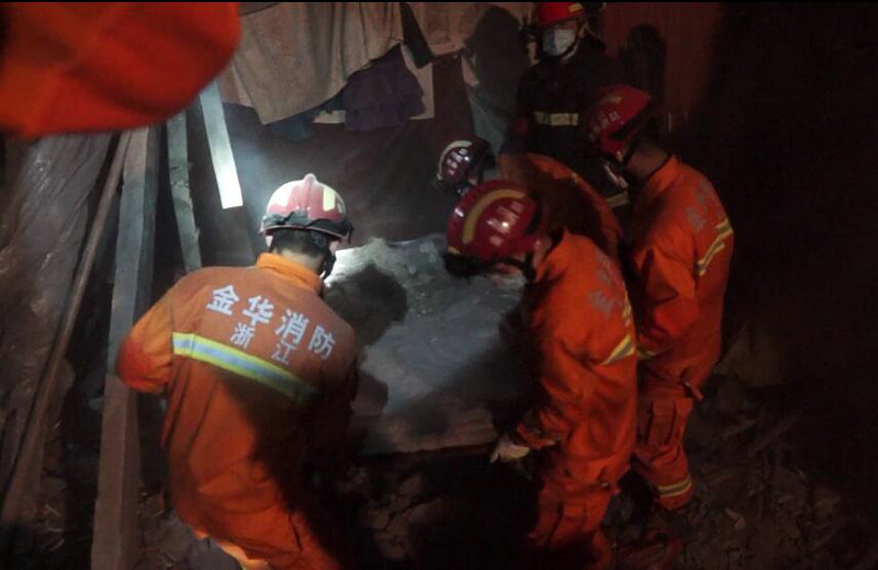 19时35分,消防官兵到达现场,此时周围已有大量群众聚集,只见事故现场一片狼籍,一幢土木结构的老房子已经整体坍塌,碎泥、碎瓦和断木混杂一起,成为一片废墟。经询问了解,事故发生后,已有多人被救出送往医院救治。由于倒塌现场情况比较复杂,屋主不在,不知道还有多少人被埋压,消防官兵立即对现场实施警戒,防止无关人员进入现场;一组官兵利用铁锹、锄头等工具小心翼翼地对现场进行挖掘搜救,确认是否还有人员被困;另一组官兵则对周围的断墙进行固定,防止墙体再次倒塌。同时,大队迅速向支队指挥中心进行汇报,金华支队先后调派金东、特勤、永康中队官兵携带生命探测仪及救援装备赶赴现场搜救。经现场再次搜救和探测,确认无其他被困人员后,消防官兵于晚上22时32分将事故现场移交给当地政府部门。