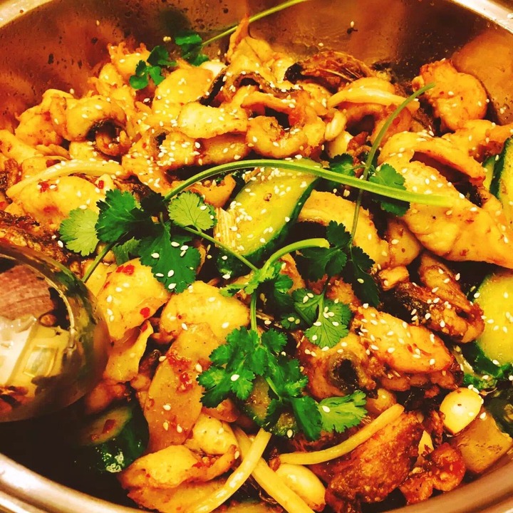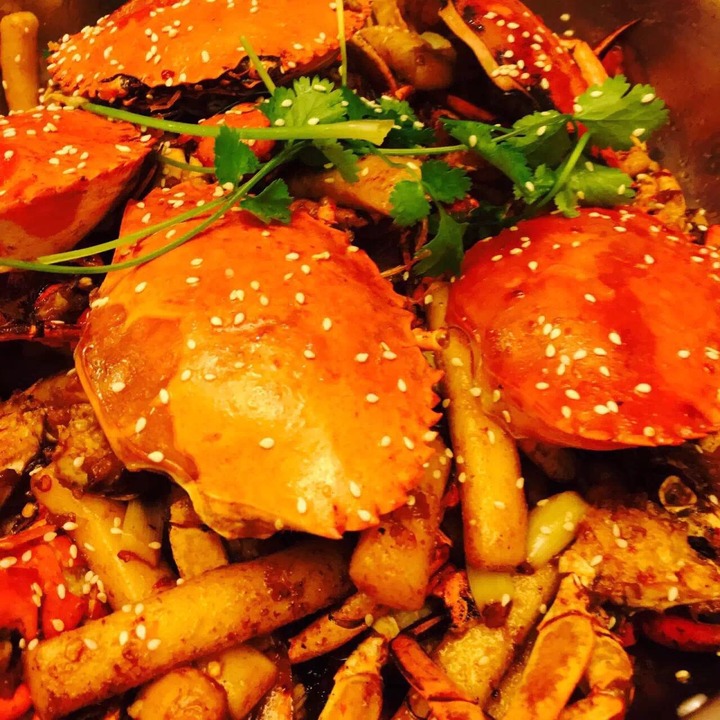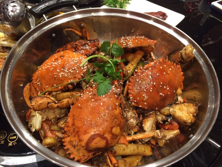首先上桌的干锅缅甸蟹。吃货君大致瞄了一眼,锅内主要搭配年糕,虽然很简约,但非常精致——蟹肉香甜,年糕入味,这一锅吃货君打99分,丢的一分是一位吃货提醒的:里面怎么能少了鸡爪?(呵呵,他是鸡爪控)