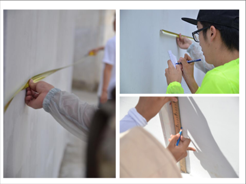 村口早已刷白的墙面,热情的村支书,围观的乡亲们,正期待着队员们给质朴的村落带来不一样的色彩。到达目的地后,队员们马不停蹄地开始测量、画框…团结协作,抓紧日光温度还未火热起来前的每一分钟。