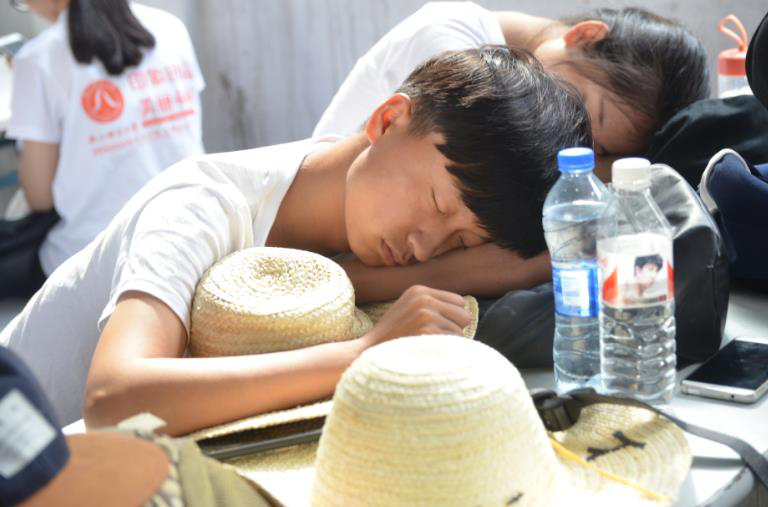 温度逐渐上升,正午,简单的中餐过后,队员们在芳林村小学的教室课桌上小憩。重温曾经趴在课桌上打盹儿的记忆…