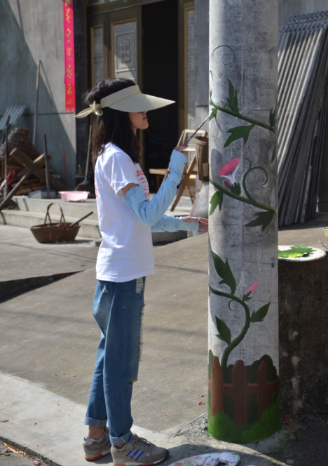 我们结合当地文化特色,想为建设社会主义新农村文化而贡献一份力量。五彩的画笔让老墙焕新颜,童趣墙、花草墙、乡土墙……甚至我们连路边一根高冷的电线杆也不放过。