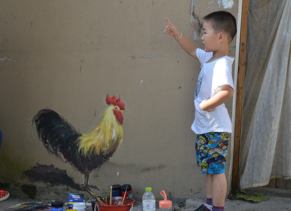 村里有非常可爱的孩子,他小心翼翼却又非常好奇地靠近我们,转过身乐呵呵地和奶奶说:“他们都是小画家!”“我想把这个公鸡抱回家!”童音里的童言童语萌翻了我们这群“叔叔”“阿姨”。