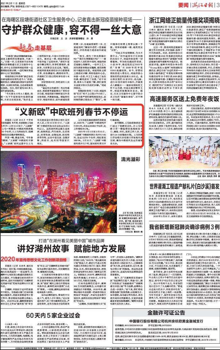 2021年1月1日至2月11日,“义新欧”中欧班列预计共开行145列,发运12276个标箱,同比增长199.9%。2月12日,“义新欧”中欧班列将开行7列,创该班列单日开行量新高。