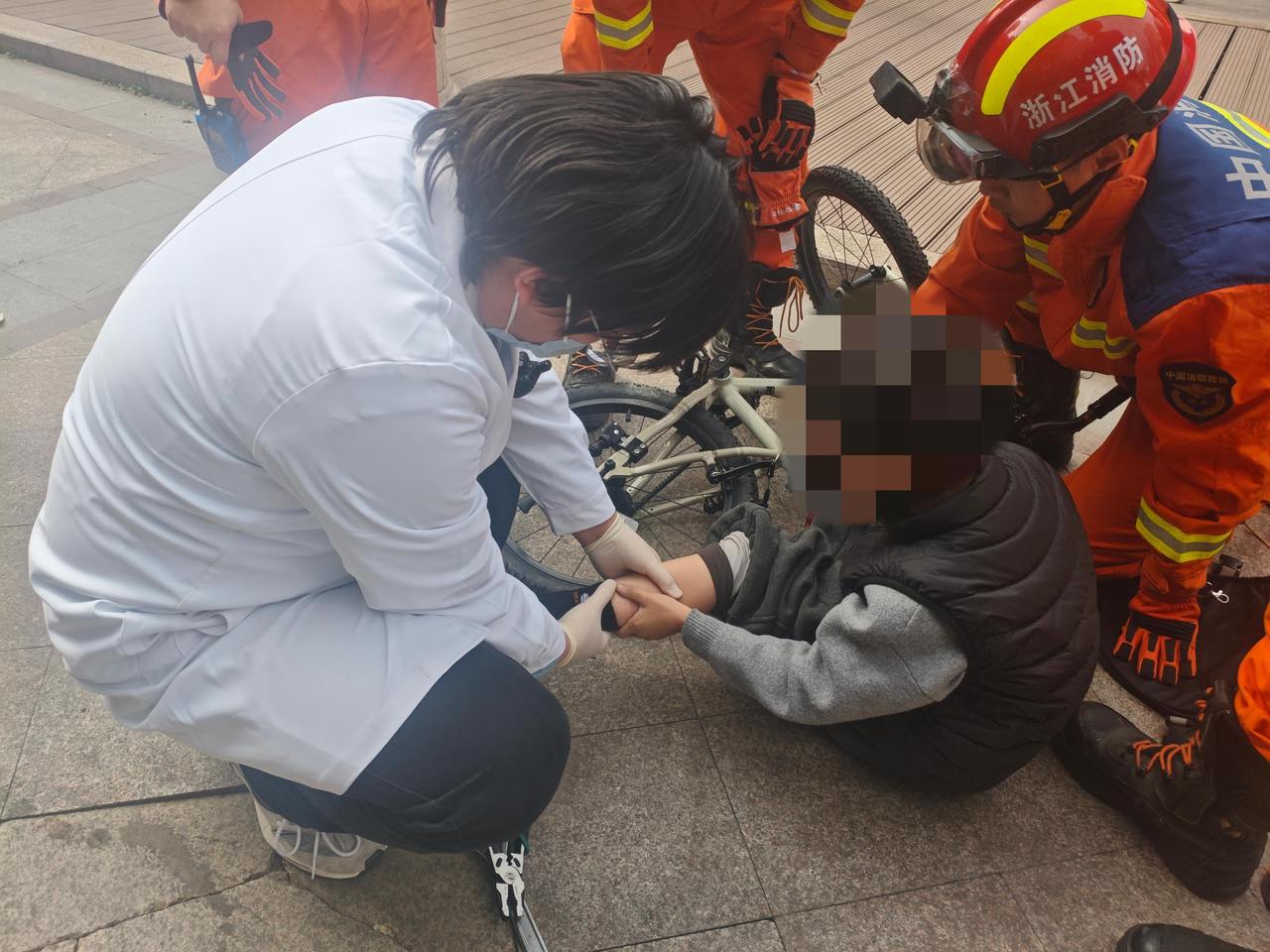 消防救援人员赶到现场时,发现男孩正跪坐在地上,表情痛苦,左脚弯曲卡在自行车曲柄内侧,车辆侧翻在一旁,家人焦急地在旁守候。为安抚男孩情绪,救援人员一边轻声安慰“没事的,很快了”,一边迅速制定营救方案。