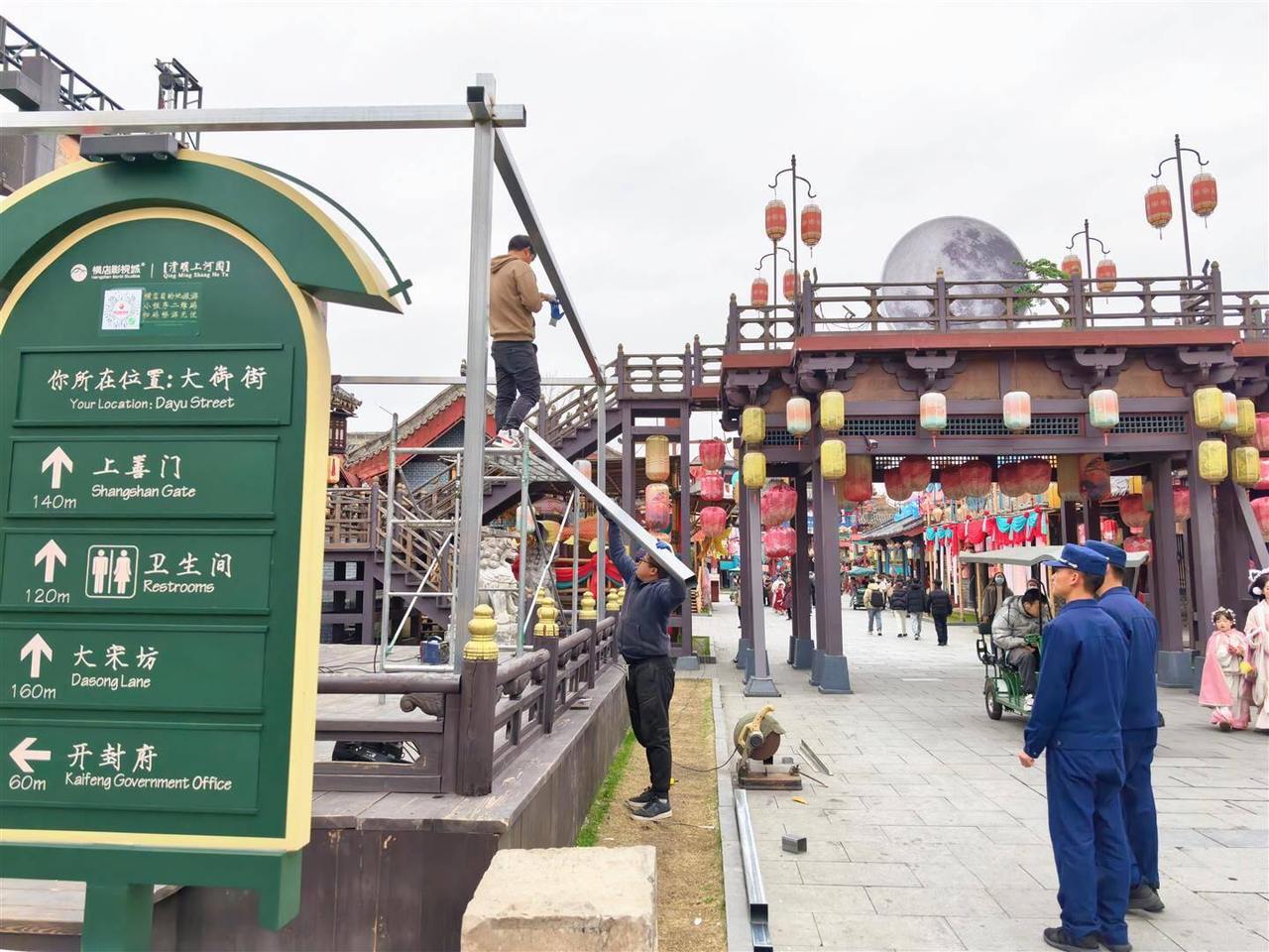 在大宋坊旁边的一个戏台上,两名消防员发现一个电焊工正在台上切割钢管,而另一人在钢架顶上焊接钢管,电焊处火星四溅。保机老也当即走过去,询问两人是否有电焊证,在检查了相关证件后,他又耐心地提醒两名工人,要及时清理下面的堆积物,避免电焊带来的风险。