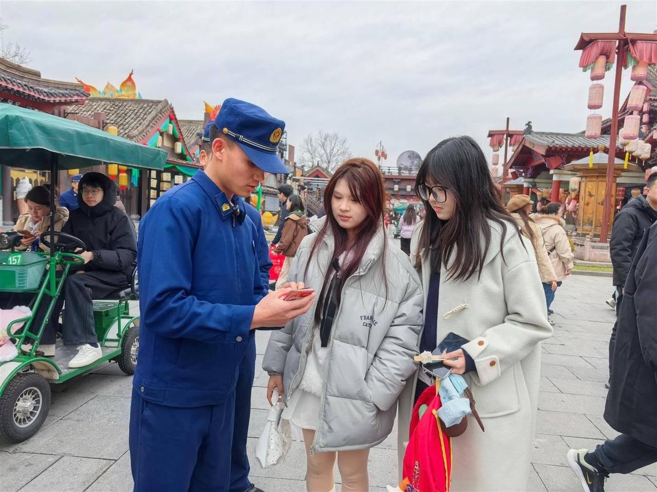 “临近春节,游客日益增多,沿街商铺的生意也日渐红火。我们每天在景区里来回巡查,主要是为了提醒商铺店主时刻注意用电用火安全。”说话间,保机老也又走进了一家糖水铺,提醒店主多留意身后冒热气的电磁炉。