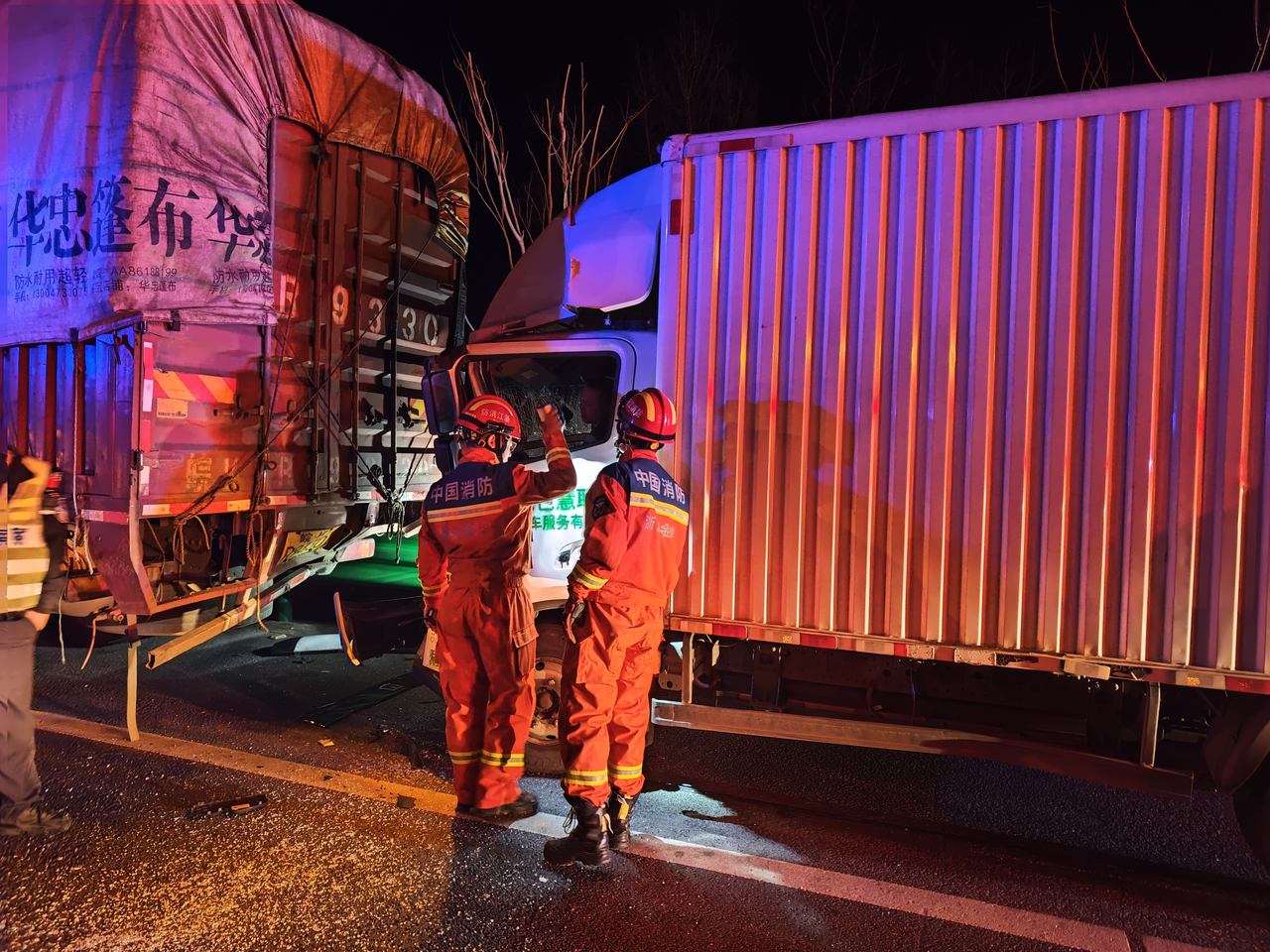 3月22日凌晨5时许,东阳市东仙线路段发生一起因分心驾驶引发的追尾事故,一辆厢式货车追尾半挂车后车头严重变形,驾驶员被困驾驶室无法动弹。东阳市消防救援局接到报警后迅速出动,历经紧张施救,成功将被困司机安全救出并移交医护人员。